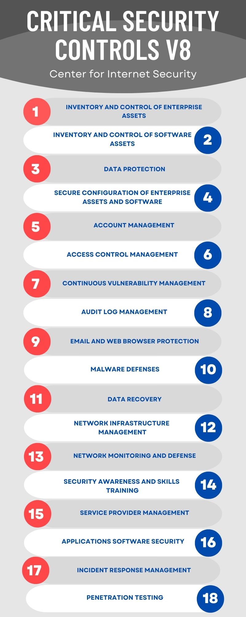 Version 8 of the CSC was released in 2021 and contains a total of 18 controls comprised of 153 safeguards. Controls and Safeguards are organized into 3 maturity levels, called Implementation Groups that help measure an organization’s security posture.